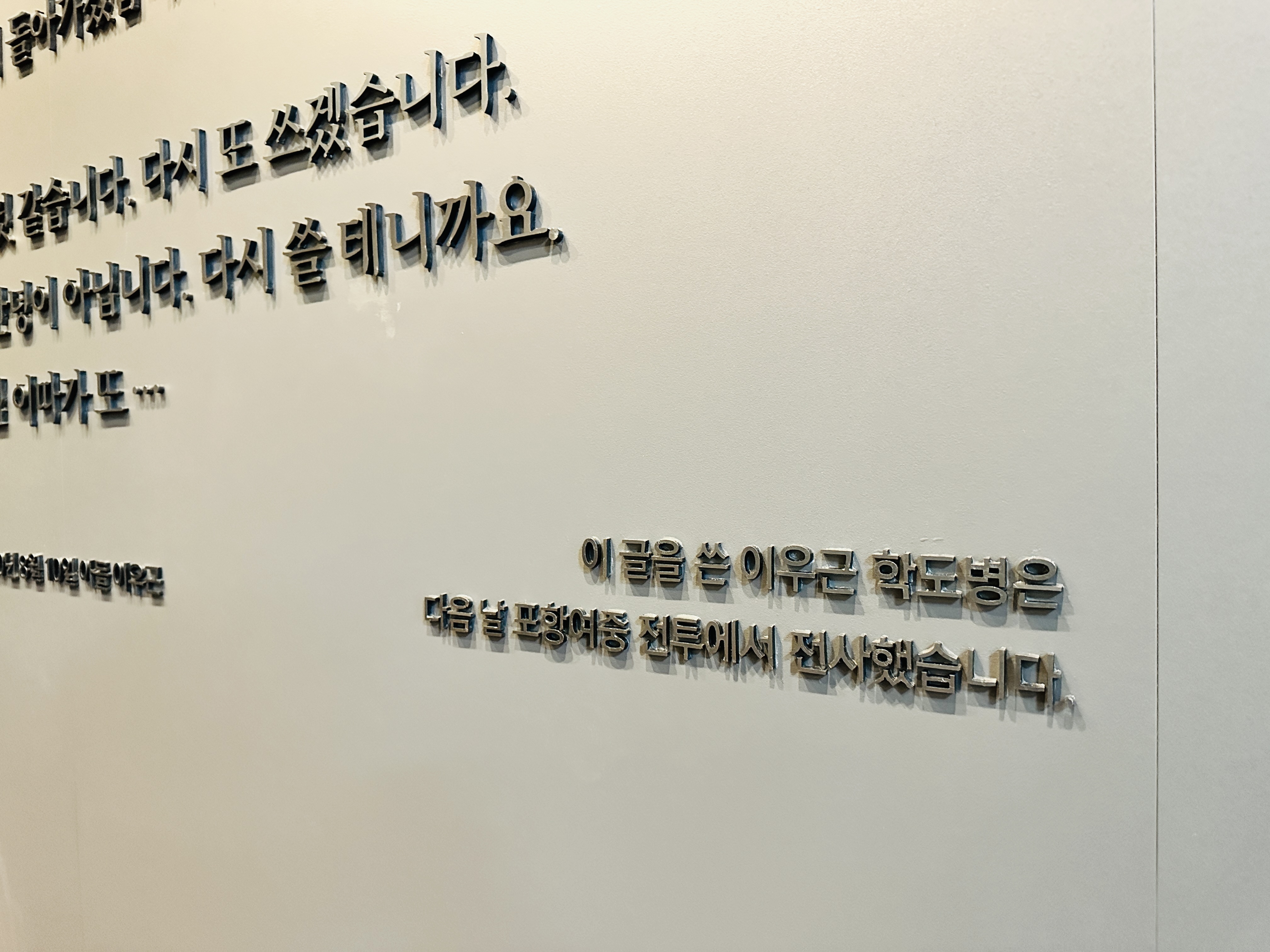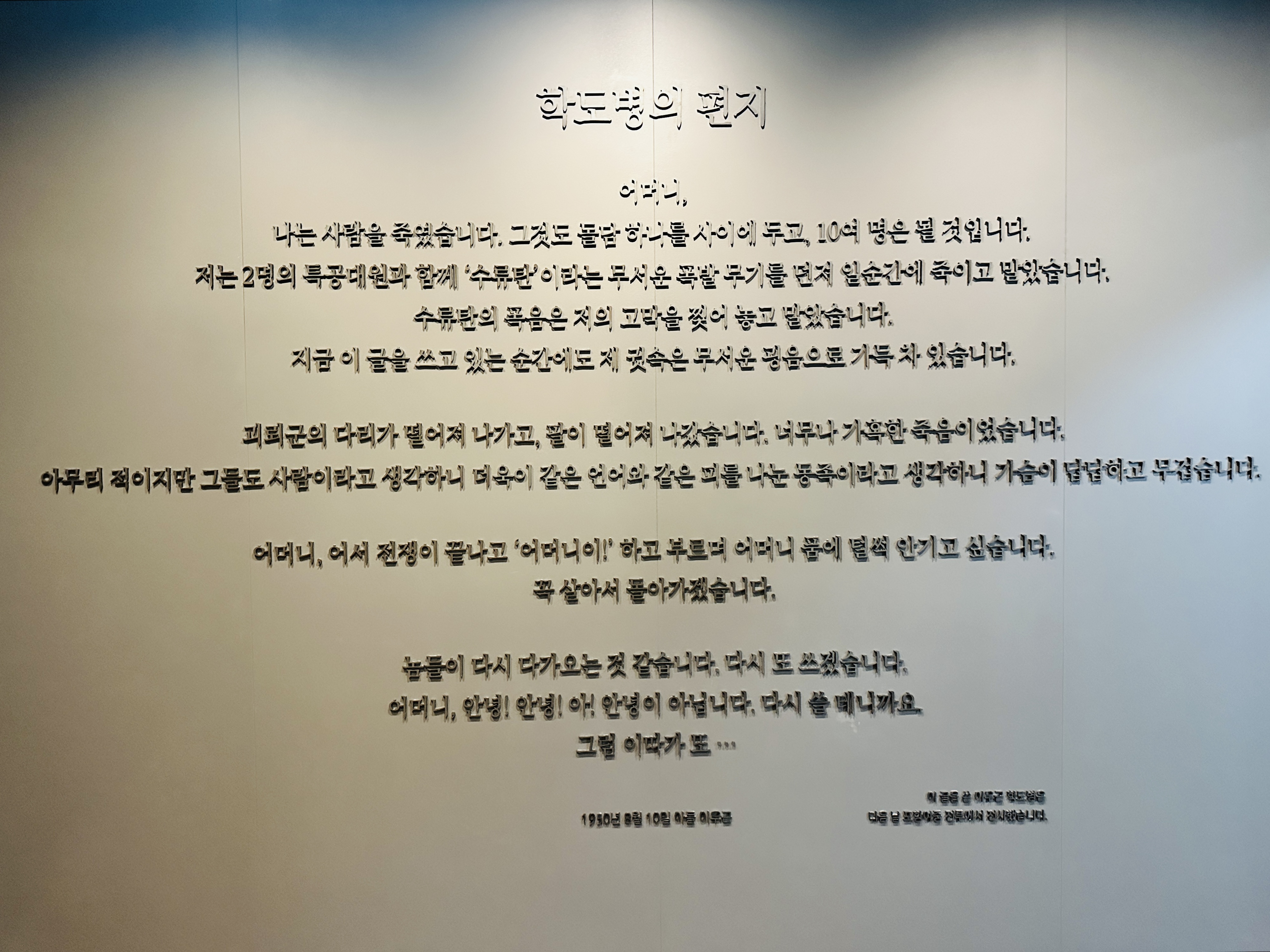 전쟁했던 상대방이 밉고, 싫고, 그래서 지금 이순간에도 전쟁을 해서라도 00을 없애버려야 한다고, 물리쳐야 한다고 생각하시나요? 순천 호남호국기념관에 다녀온 후 그런 생각이 드셨다면 이 학도병의 편지를 읽어보시길 바랍니다. 전쟁에 승자는 없습니다. 죽음과 슬픔, 소수의 싸패/권력에 미친 권력자들을 제외하곤 다수의 피해자가 있을 뿐입니다. 어떤 명분으로도 전쟁은 일어나선 안됩니다. 전쟁을 불사하겠다고 말하는 그 넘이 범인(?)입니다!!!!!!!!