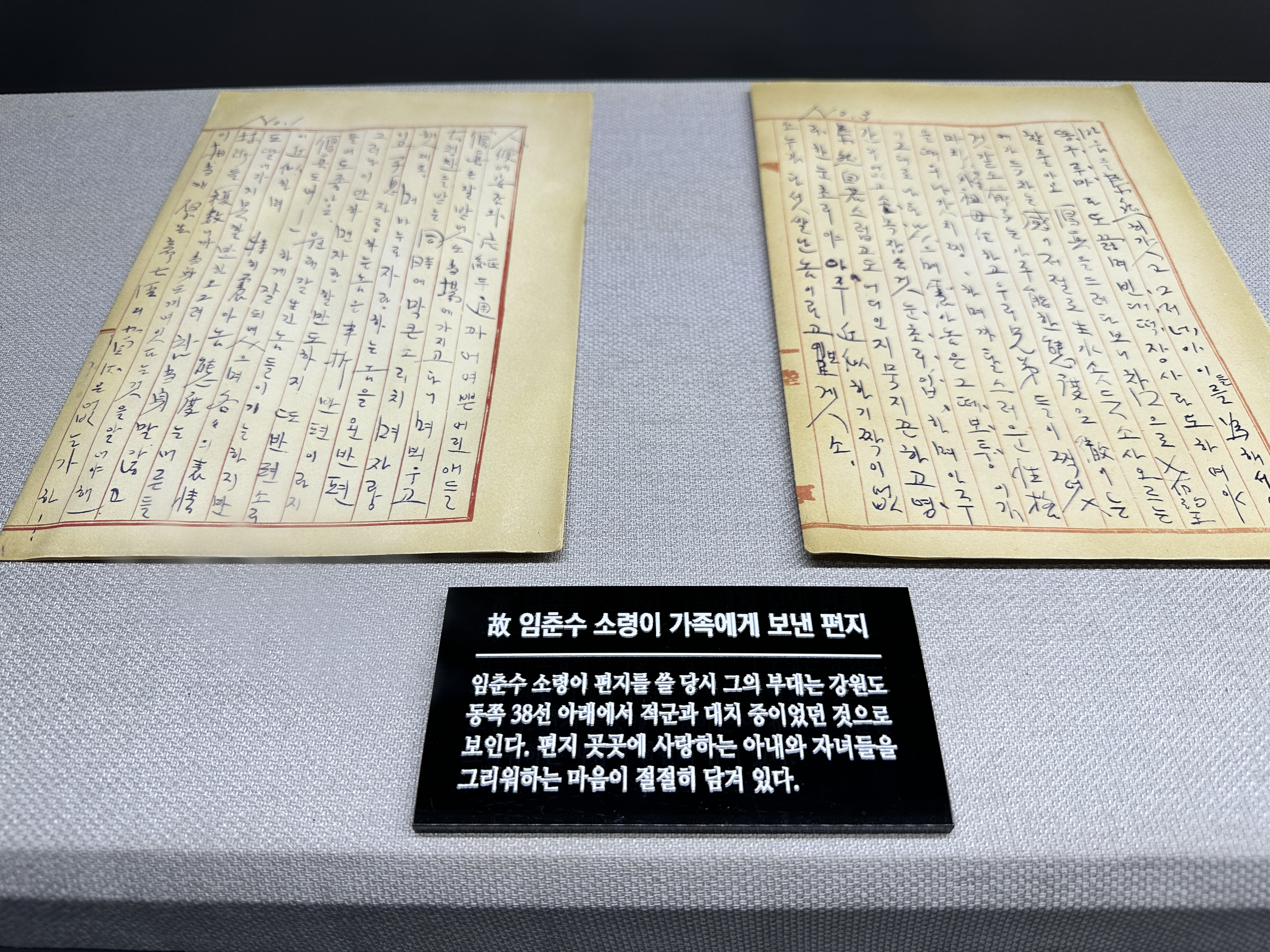 개인적으로는 당시 참전 군인 분들이 가족에게 보냈다는 편지가 가장 기억에 남아요. 실제 전쟁으로 목숨이 왔다갔다 하던 중 오만가지 감정의 파도에서도 가족을 향한 사랑과 그리움, 이들을 지키겠다는 결의로 맘을 다잡고 쓴거라 생각하니 괜히 울컥하데요.