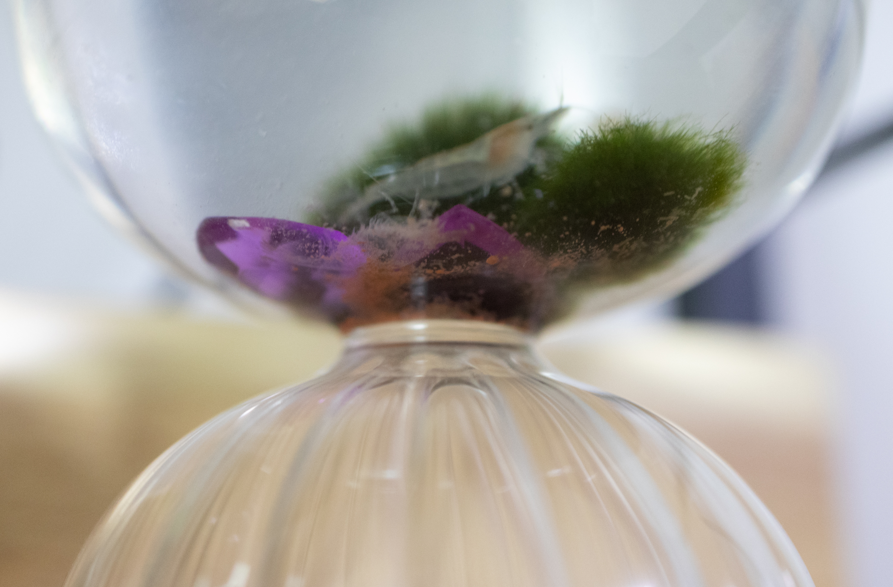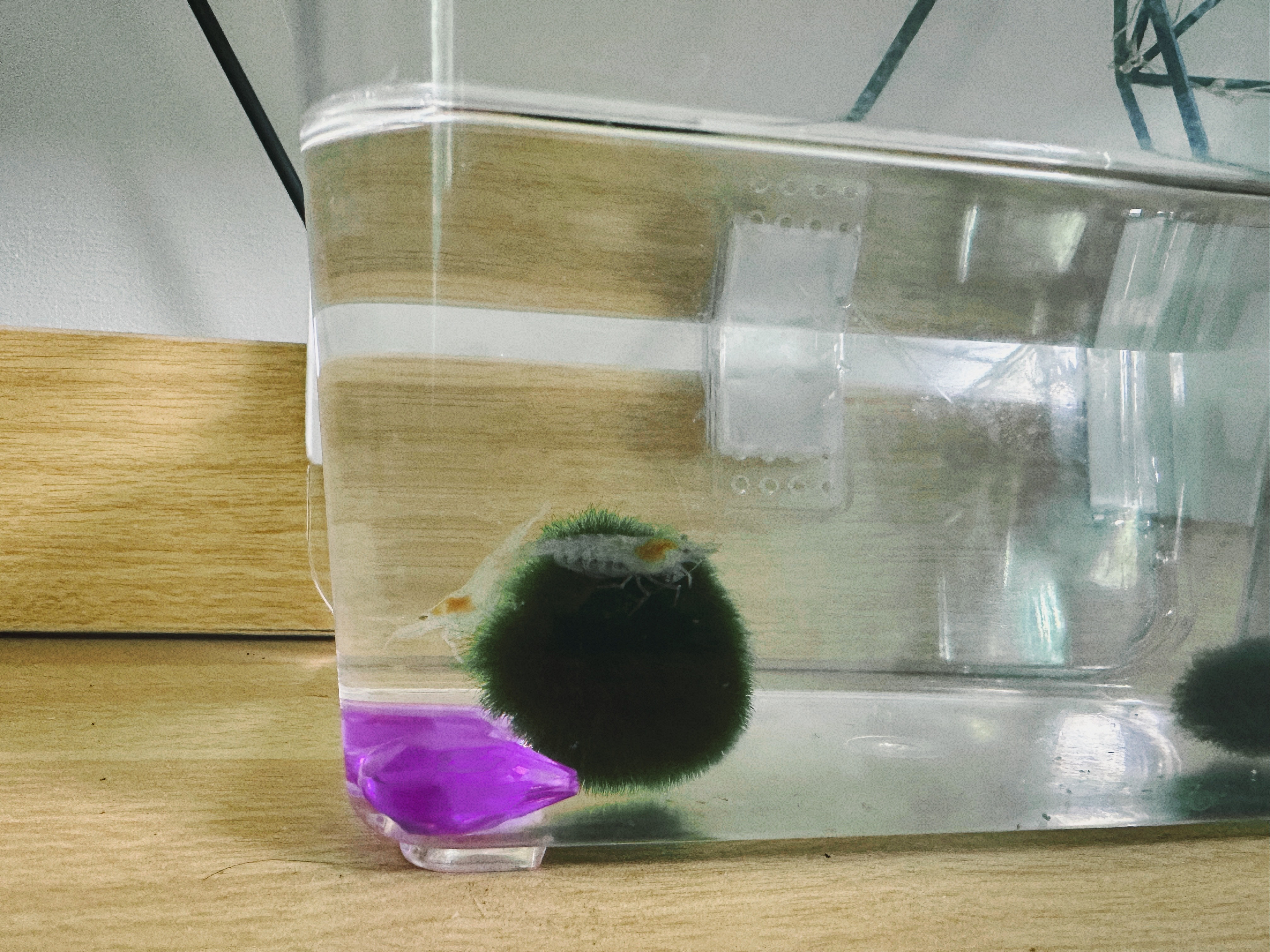 저는 우연히 생긴 두 마리를 반은 할 수 없이 반은 애정을 담아 키우는 상황이기 때문에, 집에 있는 적당한 크기의 투명 용기에 마리모 2개 넣어주고 키웁니다만! 더 제대로 해보고싶다 하는 분들은 바닥에 작은 돌 또는 흑사를 깔아주고, 생이새우가 쉴 수 있는 수초도 적당히 넣어주심 훨씬 잘 자랄 겁니다.