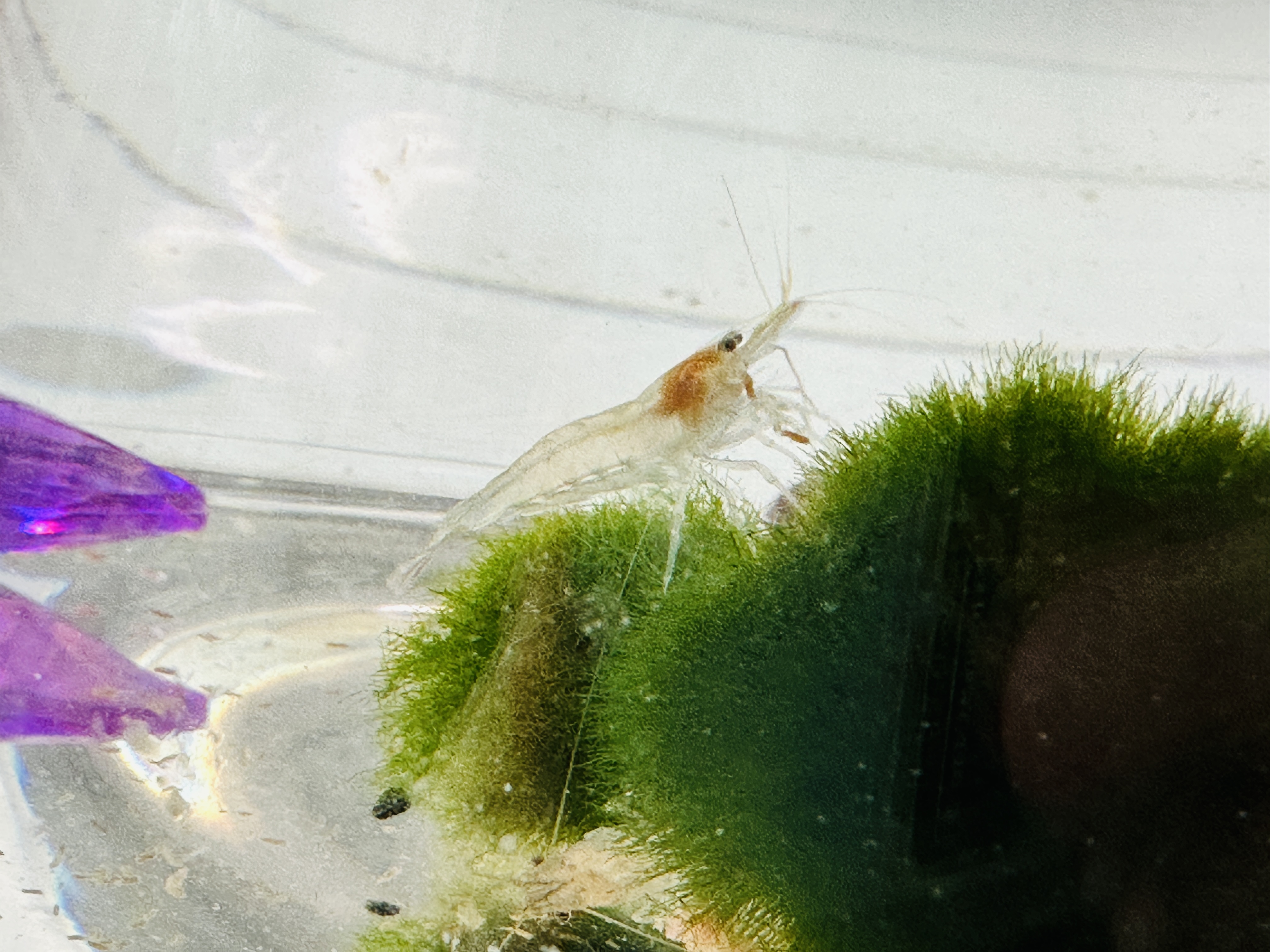 갑각류이기에 덩치가 커지면 허물을 벗습니다. 평균 3-4주에 한번 탈피한다 보심 될 것 같아요. 보라색 돌 아래, 새우 비스무리한 형체 보이세요? 전 처음에 새우가 죽은줄 알고 깜짝 놀랐지 뭐에요...... 허물이었슴돠. 3cm 정도까지 큰다고 해요. 소소한 동시에 큰 변화라 나름 역동성이 느껴집니다.