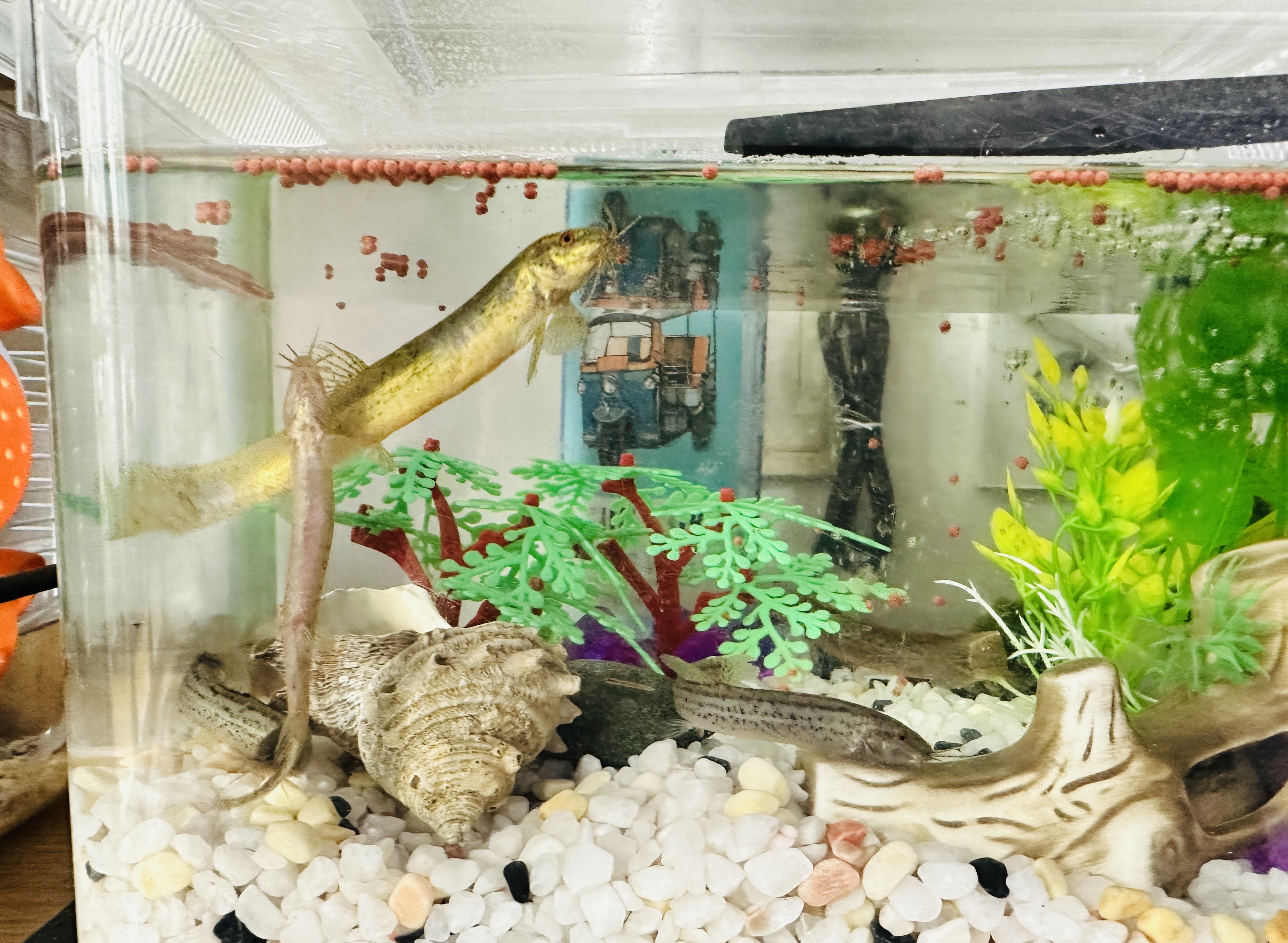 예쁘지도 않고, 귀엽지도 않고, 몸에서 자꾸 미끄덩한게 나오는지 어항 물을 갈아주면 하루만에 뿌옇게 됩니다. 그나마 수돗물에는 예민하지 않아서 미리 물을 받아놓거나 할 필욘 없어 여태 케어하죠, 안그랬음 진즉 튀김해 먹었을지도 몰라요. 기존 어항물 비우고 새수돗물 틀어 다이렉트로 넣어줍니다.